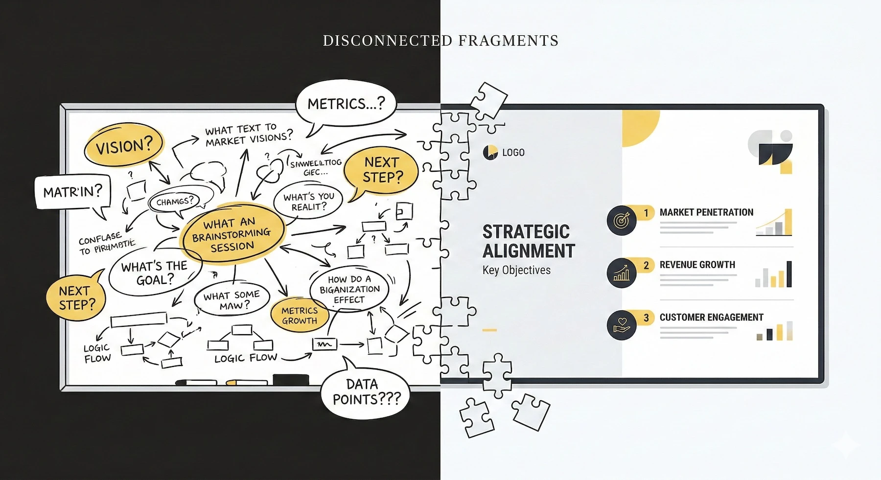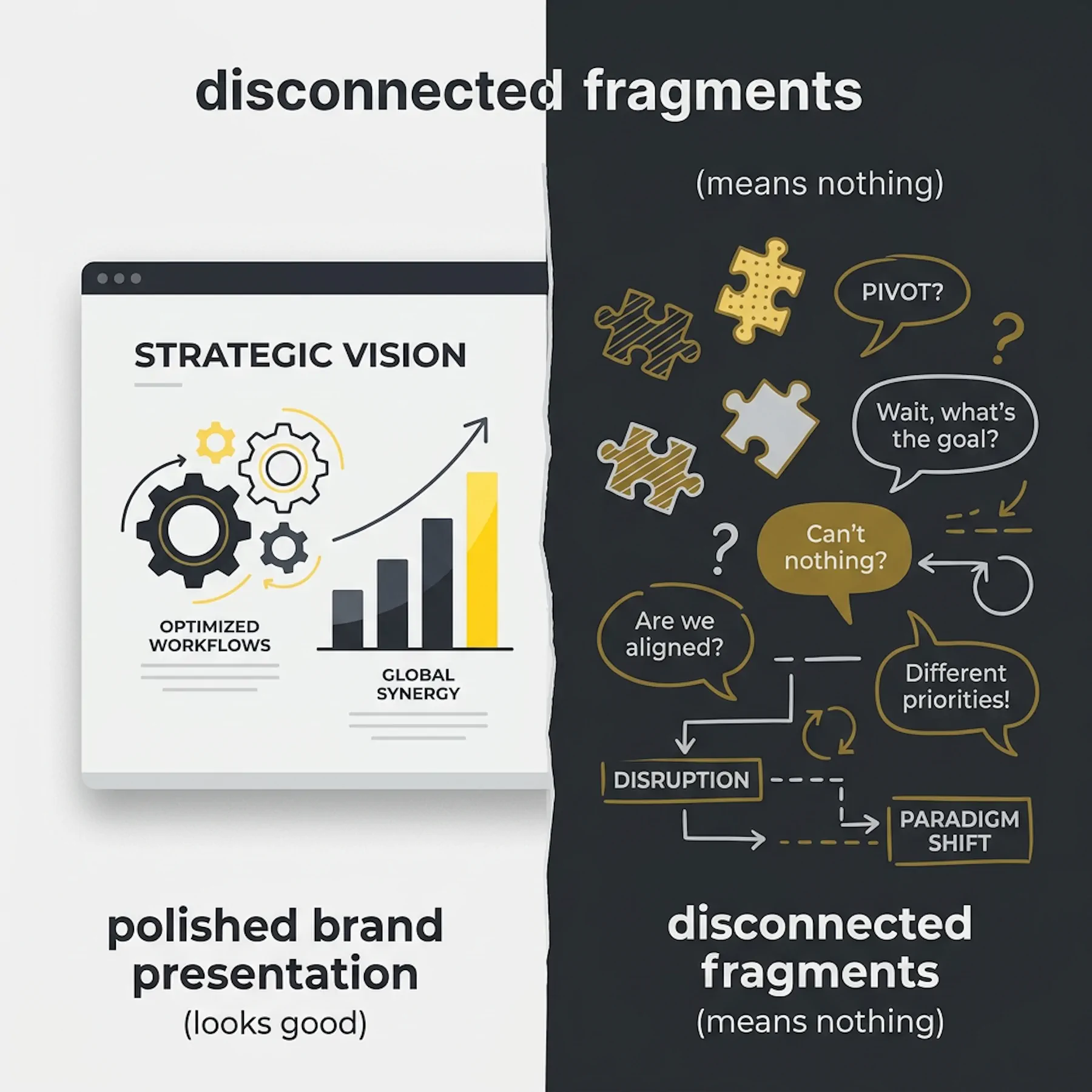 Within a few months, the cracks start showing. Sales conversations still feel disjointed. Marketing can't articulate a consistent message. New hires struggle to explain what the company actually stands for. The CEO says one thing on a podcast, the website says another, and the pitch deck tells a third story entirely.